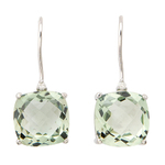 Green Amethyst Earrings Green amethyst earrings are sure to draw the attention to youSpectacular 10mm genuine cushion cut green amethyst stonesFeatures .03twt round diamond accentsAmethyst and diamonds are set in polished sterling silver with French wiresFor pierced ears onlyTotal weight (twt) refers to total size of the combined diamondsSterling silver has an e-coat so it does not tarnishShips in a purple Jilco gift box with protective tissue paper ... View Details » |