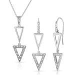 Diamond Triangle Earring & Necklace Set Superstar style is shown off with this diamond triangle jewelry setGoes great with any outfit or even better for a night outCentered around sterling silver triangle and .15twt round diamond triangleEarrings give flexible movement with euro wiresNecklace has an 18â long cable chainEarrings are for pierced ears onlyTotal weight (twt) refers to the total size of combined diamondsSterling silver has an e-coat to help prevent ta ... View Details » |