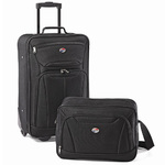 Fieldbrook II 2 Pc Luggage Set Black Retractable mono-tube handleUltra lightweight constructionReinforced corners withstands the harshest travel conditionsMultiple exterior and interior pocketsSmart sleeve on boarding bag for easy travelIncludes:Boarding Bag â 15â x 10â x 18â21â Upright â 21â x 14â x 7â ... View Details » |