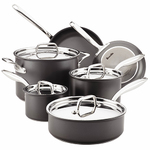 Thermal Pro Hard 10pc Hard-Anodized Cookware Set Hard-anodized aluminum construction distributes heat evenlyEngineered for heat retention from base to wallsImpact-bonded warp-resistant pan bases provide exceptional temperature controlCurved interior profiles enable full utensil accessTriple-layer nonstick inside and out provides easy food release and metal utensil safeFlared rims support a drip-free pourDual-riveted ergonomic stainless steel handlesDeep-seated mirror-polish ... View Details » |