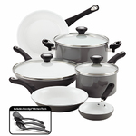 12pc Purecook Ceramic Nonstick Cookware Gray Features PFOA PTFE and cadmium-free ceramic nonstickProvides excellent food release and easy cleanupAluminum construction heats fast and evenlySkillets feature textured quilted surfaceExterior porcelain enamel is stain-resistantDouble riveted phenolic handlesOven safe up to 350FTempered glass lids5â Mini skillet8.5â Skillet10â Skillet11.5â Covered skillet5qt Covered Dutch o ... View Details » |