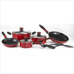 Initiatives 18-Piece Cookware Set - Red The T-fal Initiatives 18-Piece Cookware Set features ergonomic handles stay cool on the stove top and are welded, with no inside rivets to trap food. The bottom resists warping for uniform heating without hot spots and when your pan is pre-heated to the right temperature, the flavor is sealed in and food stays moist. ... View Details » |