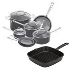 Complete Cookware Package The Emeril Lagasse 12-Piece Hard Anodized Cookware Set features heavy gauge aluminum for strength and durability. The exterior of the pan is polished before being anodized, resulting in a highly buffed, silky smooth finish. The nonstick interior has a superior three coat system, proven to be highly durable and easy to clean. Tempered glass lids help monitor cooking. The Emeril Lagasse Square Grill Pan is a true all-purpose item. This remarkable grill pan comes pre-seasoned and has a high-heat r ... View Details » |