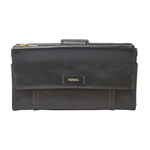 Ellis Multifunction Womens Wallet Black A wallet solution that offers tons of storage but folds compact to take up less roomHigh quality leather materialExterior features a front flap pocket with a snap closureInterior bill compartment2 Slide pocketsZipper pocketID Window12 Credit card slotsLined with 100% cottonFeatures old English brass polished hardwareDimensions: 5.5âL x 1.5âW x 4âH ... View Details » |