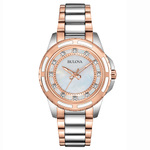 Ladies Diamond Accent Bracelet Mother of Pearl Dial Stainless steel bracelet with rose-gold tone accentsMother of pearl dial with 12 Diamond markersStainless steel caseRose-gold tone crownGold-tone hands with luminous accentsQuartz movementFold over clasp with double push button safetyCurved crystal windowCase thickness: 8mmDiameter: 32mmWater resistant to 30 M3 Year manufacturer warranty ... View Details » |