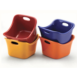 Rachael Ray Stoneware 10oz Square Ramekins Set of 4 10 oz Square ramekinsStrong stoneware constructionCan go into the oven - resistant up to 500FGlazed interiors are non-porous and will not react with foodColorful contemporary design with a playful shapeWide handles holes for a better gripMicrowave freezer and dishwasher safe1 Each: Orange Red Blue and Yellow ... View Details » |