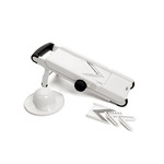 Make slicing easy clean and quick with this 7 Piece Mandolin Slicing Bowl. Great for both thin and thick slicing and large and small julienne this set includes 4 interchangeable stainless steel blades and a large stainless steel bowl to conveniently capture each slicing for immediate use marinating or for storage.