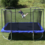 The Skywalker Trampolines backyard 14 ft square trampoline has loads of fun and bounce with the 14x14 ft. square shape. The square shape provides more jumping surface that the traditional 15 or even 16 foot round trampoline and is loaded with safety features. Extra wide rust resistant springs create a fun and exciting bounce. The trampoline frame construction uses a heavy gauged steel that is galvanized for rust resistance. Specially designed t-sockets are used at each frame and enclosure joint, creating a uni-bodied frame. This extra strong trampoline also features an enclosure net design that interlocks the enclosure netting directly to the jump mat at each v-ring using a button-hole feature which eliminates gaps with no ropes to thread. All materials are made to be durable with UV resistant materials for longevity.