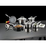 The T-fal Precision Ceramic Hard Anodized 12-Piece Cookware Set is a beautiful addition to any kitchen. It combines extremely durable hard anodized technology with the stain and scratch-resistant ceramic non-stick surface. The cooking surface is PTFE and PFOA-free and withstands cooking temperatures of up to 570°F, great for searing and braising. The riveted silicone handles are comfortable and durable enough for every day use and the vented glass lids make monitoring the cooking process easy.